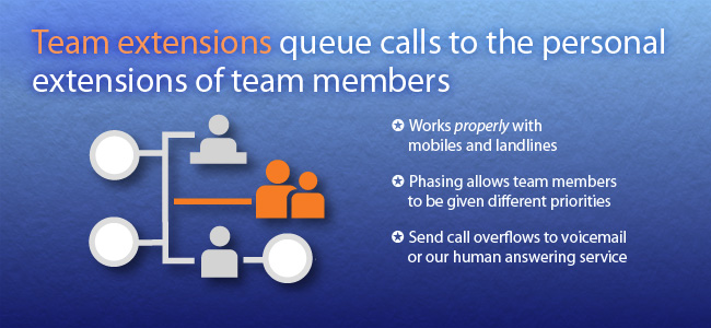 When you are busy with lots of calls it's important that you don't leave callers waiting too long. The team extension 'hunts' the available team members until one takes the call. |