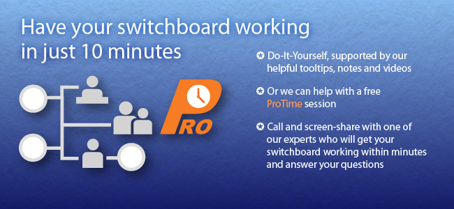 Basic set up takes about 10 minutes. The starter pack comes with a free ProTime set up session, where one of our friendly experts helps you to get your switchboard up-and-running, assisting you in the creation of your first plan.